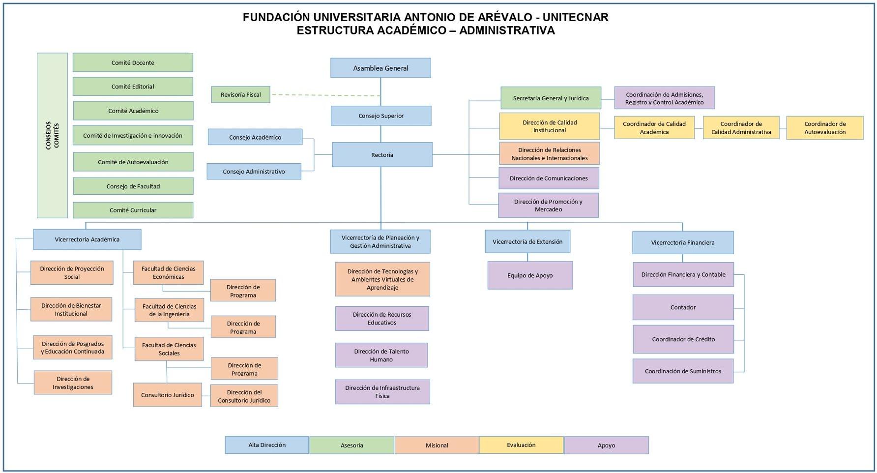 Teniendo en cuenta los lineamientos del Proyecto Educativo Institucional, y para dar cumplimiento a los objetivos allí propuestos, la Fundación Universitaria Antonio de Arévalo - UNITECNAR soporta su gestión en la siguiente estructura Académico - Administrativa: